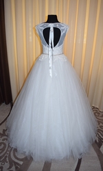 Очень нежное свадебное платье из новой коллекции. Пошив 2017 года. Ручная подшивка. Размер 44. Цвет – молочный. По спинке застегивается на потайную тесьму-молнию. Длина юбки от линии пришивания – 120 см. По низу фатина настрочена корсажная лента. Спинка с интересным круглым вырезом. В комплекте идет съемный регулируемый цепочка -поясок с камнями. Детали по тел. 0956083386 |